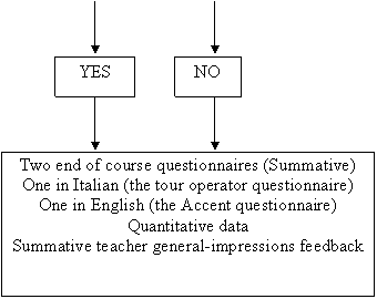 It was seen as important to explain what was going to be measured and ensure that data collection procedures provided data necessary for this purpose. However, a fundamental weakness of the evaluation design described above was the anecdotal/informal nature of the formative data elicited from students by teachers, group leaders and the director. Would students really say what they thought? Would students say the same things to different people? Would students of this age group be a reliable source of data? Would the place in which the students filled the questionnaires affect the reliability of the data? (i.e. the Accent questionnaires were given to students during class time, whereas the Italian group leader questionnaires were given to students on their buses during excursions). In this context, it was not possible to research the above questions.