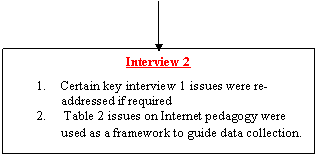 A research framework was formulated by creating two tables based on pertinent literature and professional context. These tables were used as the anchor for guiding the data collection. The areas that were analysed in Table 1 (refer to appendix 1) were: confidence, competence, time, components comprising Internet site quality, and some other potentially relevant domains of research. Table 2 (refer to appendix 2) looked at Internet lesson planning, student epistemology[4], syllabus design, improvement, roles and change.