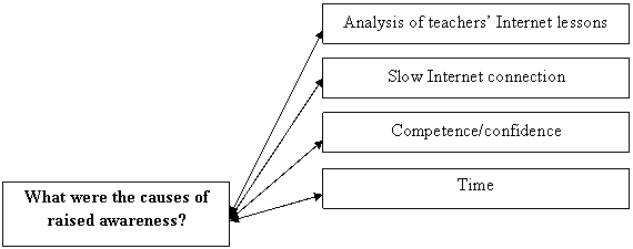 The second stage involved trying to establish the causes of teachers’ raised awareness. Figure 3 below attempts to capture visually the processes I followed. Questions regarding the likely cause(s) of raised awareness were addressed by analysing the implications of key-theme data. Then I developed theory regarding Internet pedagogy (this theory will be discussed in sections 8.1, 8.2 and 8.3.1) and change (i.e. discussed in section 8.4).