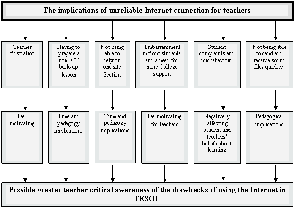 The data implied that the main technical problem that hampered teachers in this study pertained to unreliable Internet connection; the six points below in Figure 4 comprise the main issues, and affirm, as in Bastid (2002), that there is a need for reliable Internet access. Additionally, it follows that not addressing this issue has a number of teacher and student ramifications. In figure 4 I move from a summary description and interpretation of the six points to the construct of greater teacher critical awareness of the drawbacks of using the Internet in TESOL. The main implication therefore of unreliable Internet connection for pedagogy is teachers should not rely on one site; moreover, they may also have to prepare back-up lessons if there is no Internet connection. There are also pedagogy implications of not being able to practise speaking and listening skills easily in the Lab. This in turn may have some ramifications for student epistemologies and teachers’ teaching styles i.e. students may expect some speaking and listening practice.