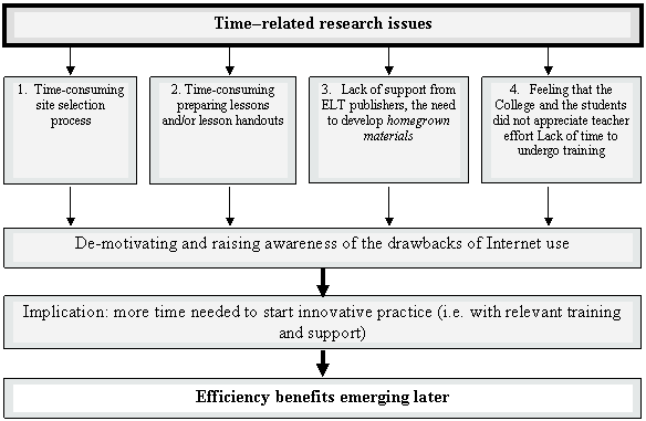Figure 6 below attempts to link the issues discussed in this section to outcome. Its implication for the concept of time as a management of change phenomenon is, more time may be needed to start innovative practice with efficiency benefits emerging later (i.e. time is needed for new ideas to percolate through to teachers en masse). This implication echoes with Downes et al., (2001: 75) who assert that teachers, researchers, and policymakers consistently indicate that the greatest challenge to implementing effective professional development is having time to understand new concepts, learn new skills, develop new attitudes, research, reflect, discuss, access, try new approaches and integrate them into their practice, time to plan their own professional development. Moreover Manternach-Wigans et al. (1999 cited in Jones 2004: 15) also hold that teachers need more time to learn computer basics, plan how to integrate technology into their lessons, and actually use the technology in the classroom.