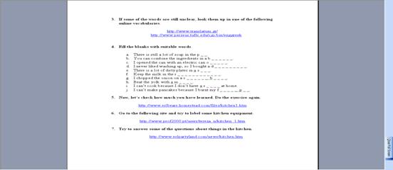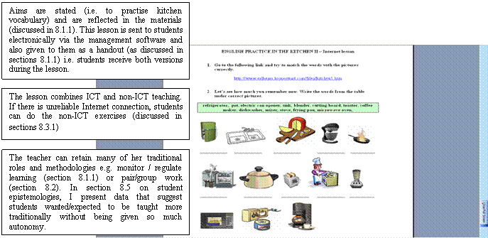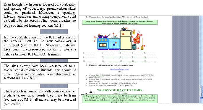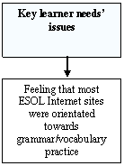 · Select suitable sites level-wise (i.e. grammar/vocabulary) and topic-wise. However data suggested that this was a difficult undertaking. Teachers first had to search ESOL homepages (i.e. from a vast and growing collection of homepages) and then choose exercises usually from a substantial assemblage of exercises per ESOL homepage. Moreover a pertinent characterisation of the data was that ‘searching’ for a list of possible lesson sites was more time-consuming than ‘choosing’ which sites from that list would be used. Finding suitable course-relevant Internet lesson sites was therefore a difficult task. Godwin-Jones (1999: 12-16) holds the opinion that a troublesome issue with Internet-use is locating desirable Websites that are appropriate in terms of language level, media format, interest and reliable information. Furthermore, it was very time consuming to prepare lesson handouts in Word or PowerPoint format.